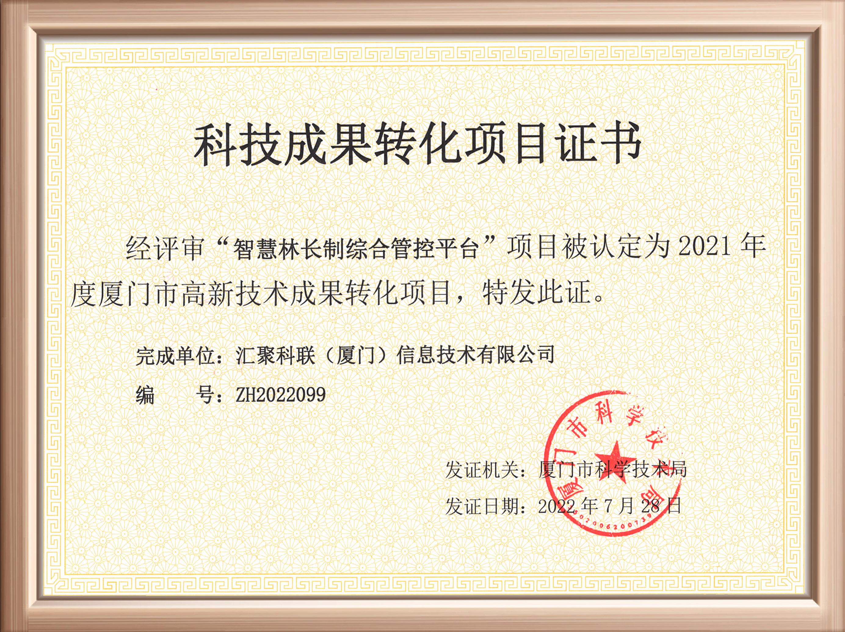 近日,匯聚科聯(lián)收到廈門市科技局頒發(fā)的“科技成果轉(zhuǎn)化項(xiàng)目證書”,公司“智慧林長(zhǎng)制綜合管控平臺(tái)”經(jīng)過評(píng)選,成功被認(rèn)定為2021年度廈門市高新技術(shù)成果轉(zhuǎn)化項(xiàng)目。